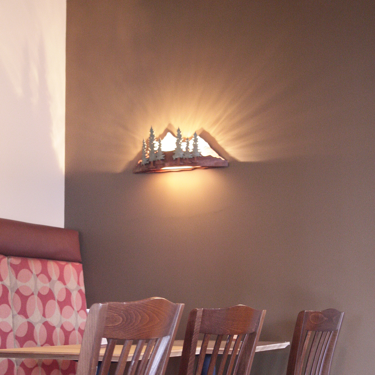 In planning for the expansion into the owner also wanted a real statement piece for his newest locations. He liked the look of our Impression Bath Pine (A31442) fixture, but was thinking a lot bigger (at least 6 feet bigger!). First we matched our image set to their signature tree image that they use in their logo. We know branding is very important to our commercial clients and we take several steps along the way to make sure your image or logo is preserved the way you want it to be. We then increased the size of the fixture from 36" to 9' wide x 36" tall to produce what is our largest sconce to date. The up scaling of metal art light fixtures in our line is a common request; our in house design team is able to meet virtually any request for a change in size on any of our hand crafted light fixtures. On this particular piece they were at an early phase of construction on their location, which allowed us to work closely with the builder and electrical contractor to ensure proper mounting support and electrical load capacity were reached. We were also able to help select the appropriate location in their space for the fixture. When working on your custom, it is our pleasure to communicate directly with your service staff to insure proper installation of your custom light fixture. The piece was finished in our Black Iron Powder Coat (97), for a durable finish that will withstand years of use and cleaning in their foodservice environment.