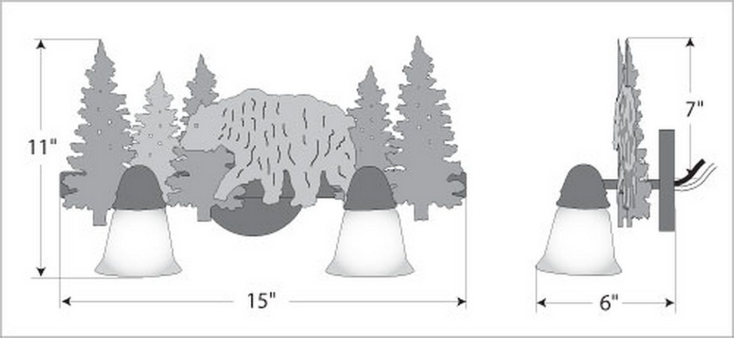 The Lakeside Double Bath Light - Bear features handpainted trees and our bear artwork with handcut interior lines. There is a choice of six different glass globes, the smallest of which only takes A15 bulb. This rustic bathroom vanity light will add warm lighting and rustic character to any bathroom, hallway or over a kitchen sink. Note: This fixture was redesigned in March 2010.
