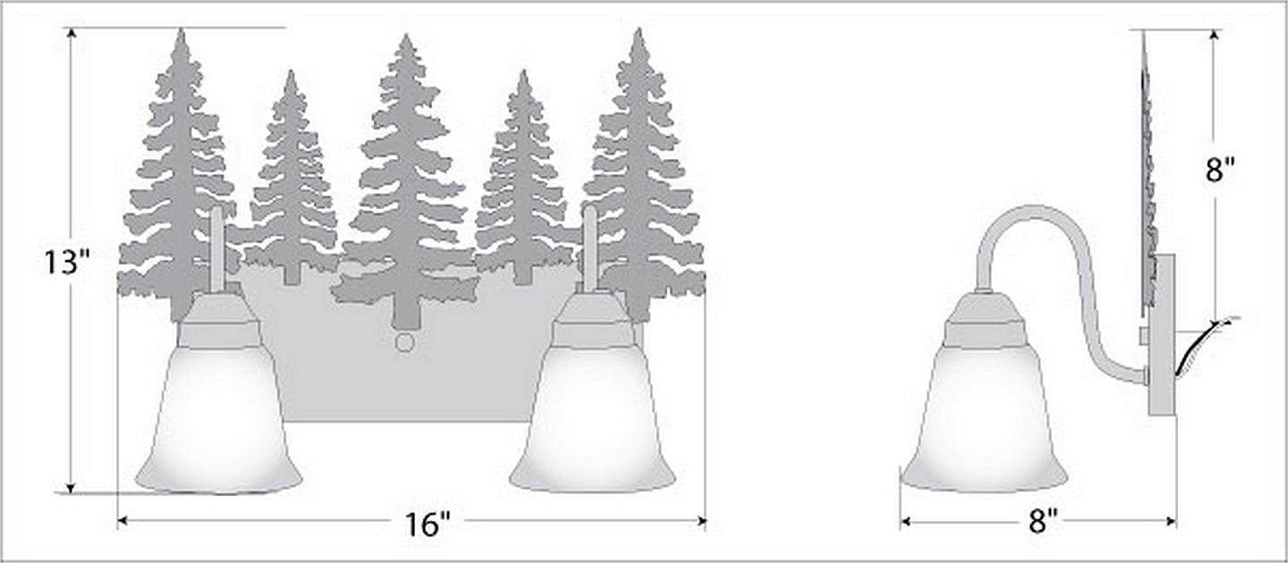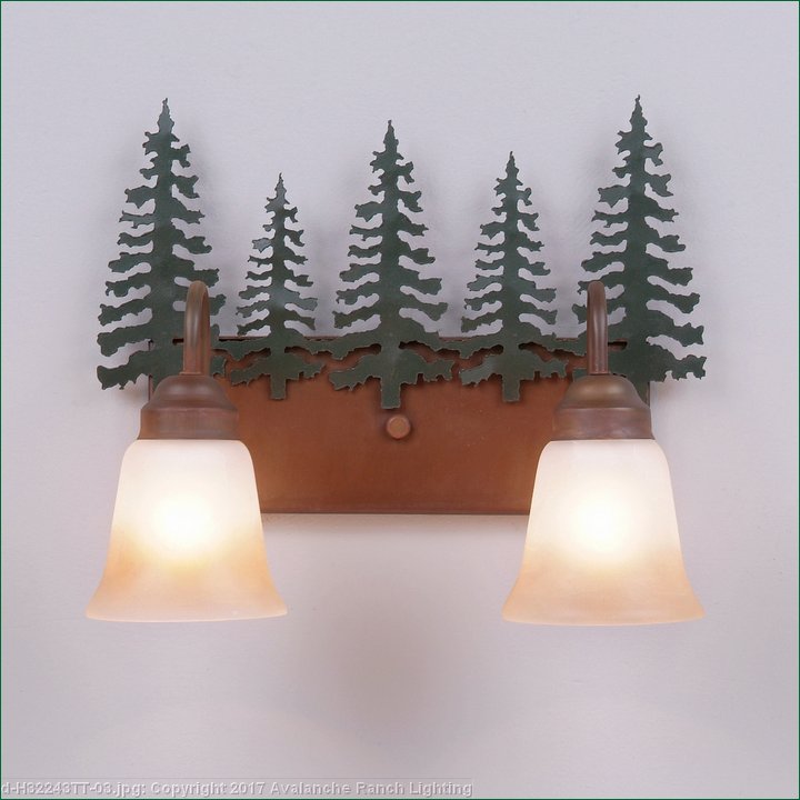 Affordable and pratical bathroom lights make the Wasatch Bathroom Vanity lights one of our best selling series. Offered with a choice of eight different styles and colors of glass globes, this fixture gives abundant light and rustic character to any bathroom. This item is the Wasatch Double - Cedar Tree and is Pictured in Finish #03 - Cedar Green trees and Rust Patina base.
