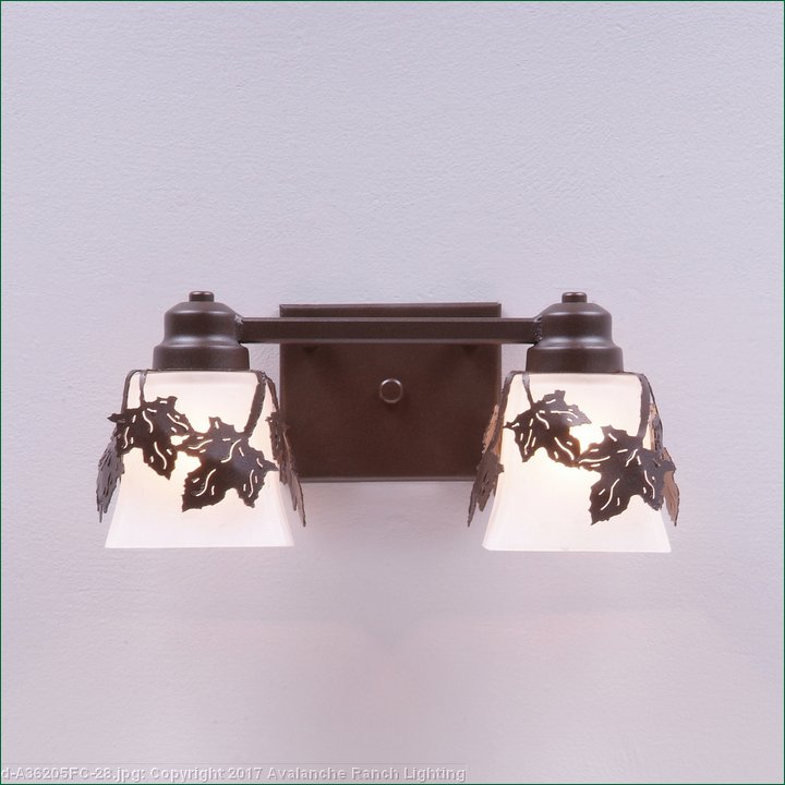 The Woodland Double Bath Light - Maple features two pieces of square mission style glass and simple leaf designs surrounding the glass. The Maple leaves have hand-cut interior lines which gives each image a unique look. Choice of glass color between Frost Clear and Tea-Stained. This fixture may be hung with bulb pointing up or down. This sophisticated take on traditional rustic lighting will generate a warm atmosphere in any bathroom.