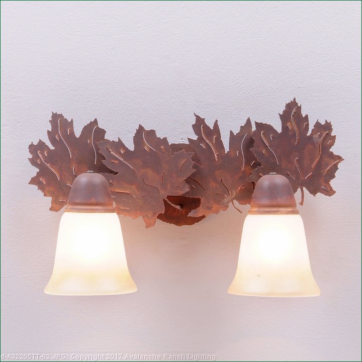 The Lakeside Double Bath Light - Maple features maple leaves metal art with hand-cut interior lines. There is a choice of six different glass globes, the smallest of which only takes A15 bulb. This rustic bathroom vanity light will add warm lighting and rustic character to any bathroom, hallway or over a kitchen sink. Note: This fixture was redesigned in March 2010.