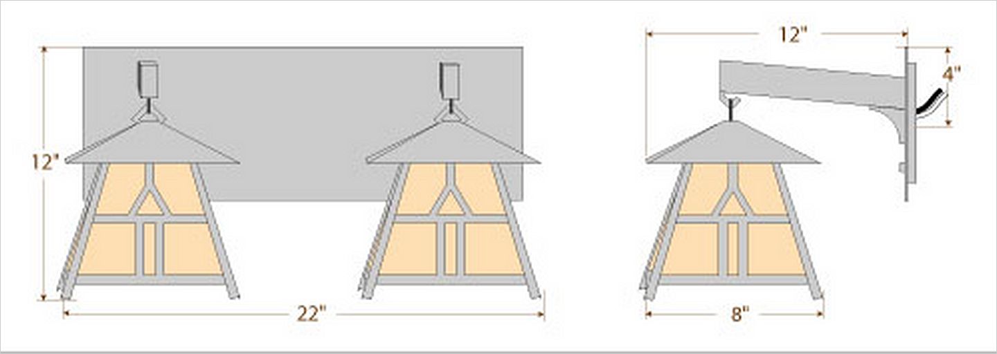 The Smoky Mtn. Double Bath Vanity Light - Westhill features two Smoky Mtn small lanterns hanging at a slight upward angle from two steel arms. The front and side panels all feature our exclusive mission-style artwork. The lanterns also come with a diffuser material choice between Almond or Amber mica. The fixture attaches to the wall with a separate 4-inch tall fireplate, which allows for either a direct placement over a junction box, or 8 inches to the left or right of center. This mission-style bathroom vanity fixture will bring warm lighting and character to any craftsman style bathroom. Hardwire is standard.