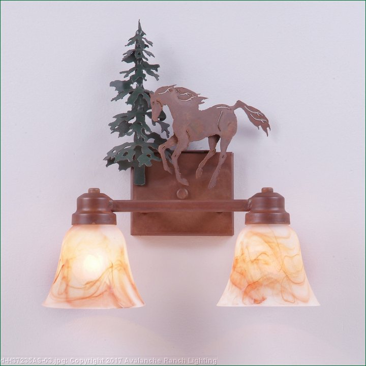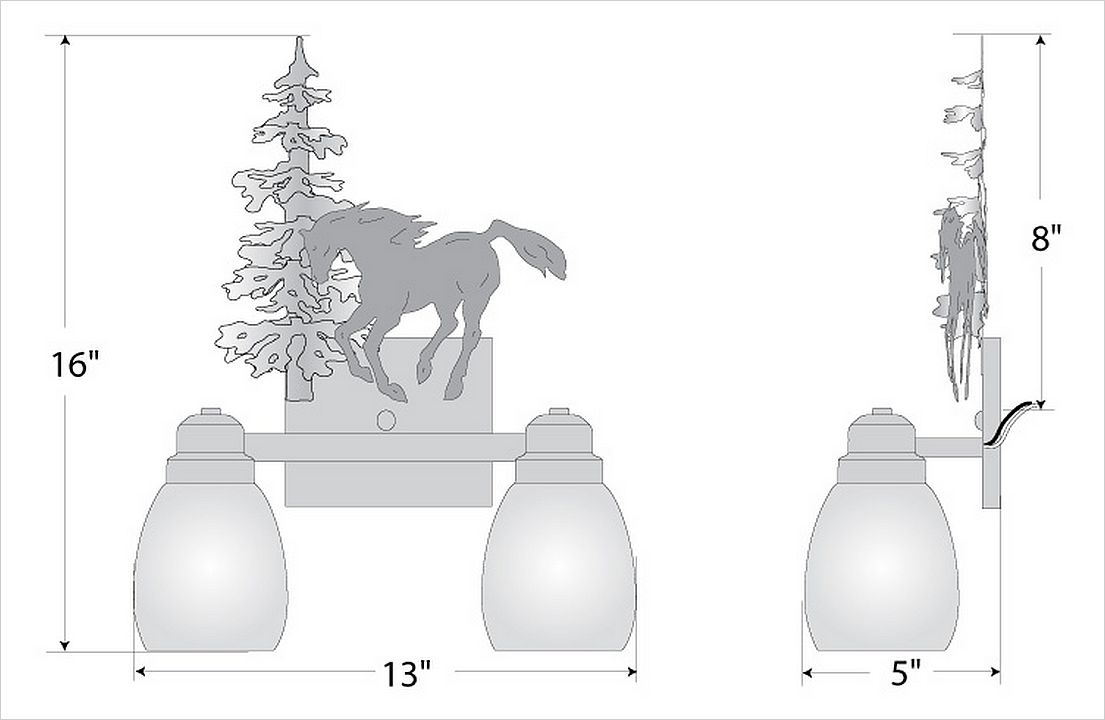 The Parkshire Double Bath Light - Mtn Horse is a two-light vanity fixture which features three-dimensional metal art images of both a horse and a cedar tree. There are seven different glass globes that fit this bath vanity, so you can pick a style that suits your decorating needs. This light will provide abundant light to any bathroom, whether in a log cabin, or in a traditional home where a eye-catching decor style is desired. Hardwire is standard.