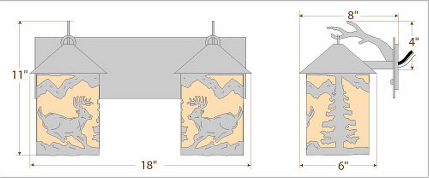 The Cascade Double Bath Vanity Light - Mtn Deer features the Cascade small-size lantern hanging from a steel branch arm with a deer metal art image on the front of the lanterns, facing each other and a single spruce tree on the side of each lantern. Mica is on the inside of each lantern cylinder, with a choice of color between Almond or Amber. Attaches to wall with a separate 4 inch high fireplate which allows for direct placement over a junction box or 8 inches to the left or right of center. This rustic bath vanity light is ideal for bringing rustic character and lighting to any bathroom. Hardwire is standard.