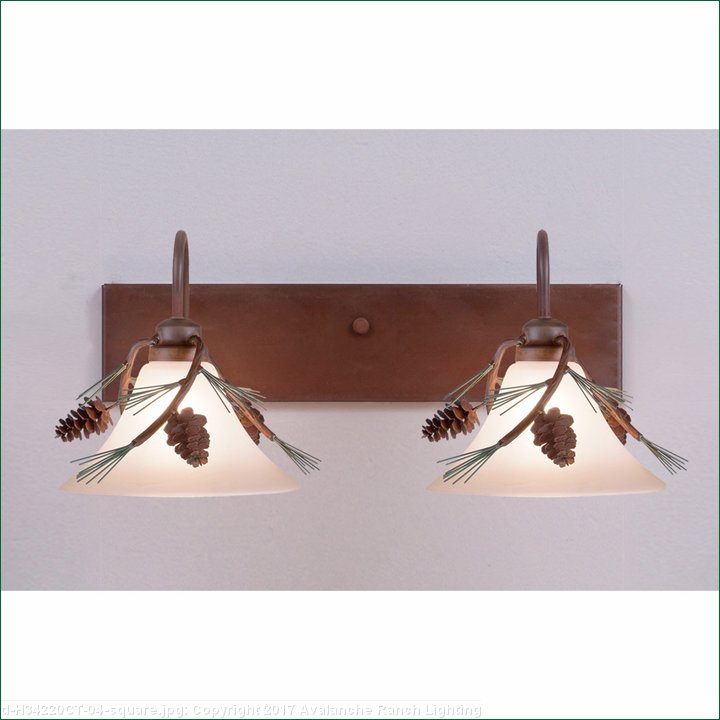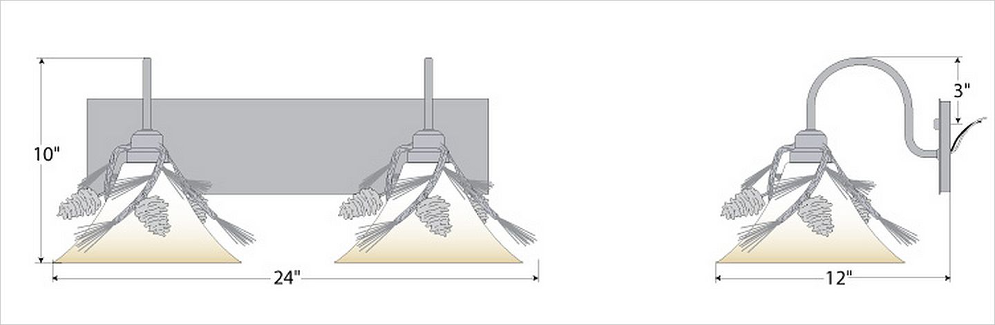 The Cedarwood Double Bath Vanity Light - Pine Cone features our handmade metal pine cone and needle adornments and a choice of glass between two cone glass globe styles. Available in a variety of finishes this rustic bath light is great for anywhere to add warm lighting and customizable rustic character to your log home, cabin or northwood lodge-themed bathroom.