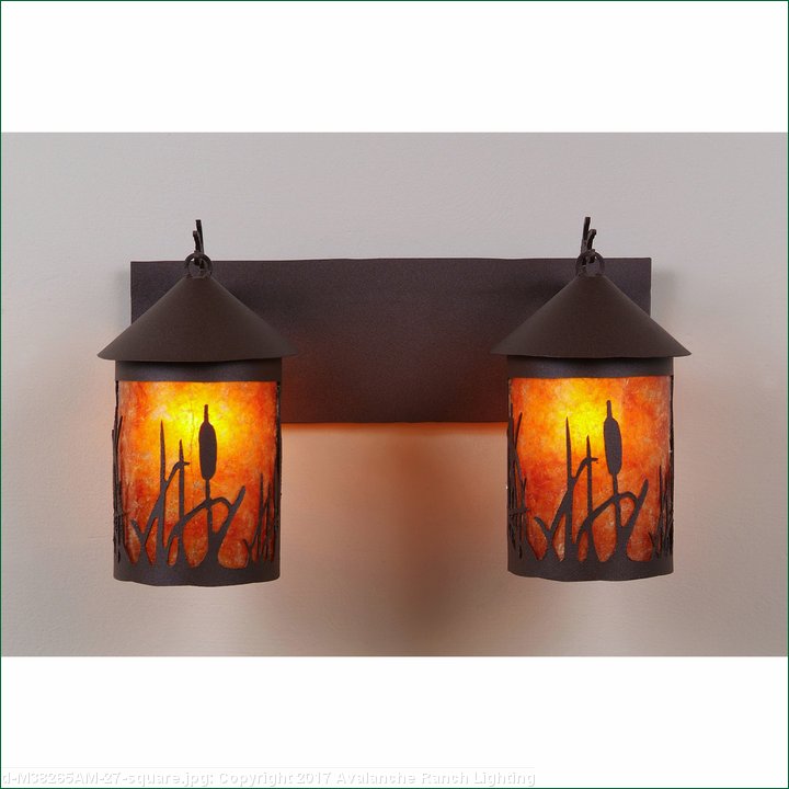 The Cascade Double Bath Vanity Light - Cattails features the Cascade small-size lantern hanging from a steel branch arm with a Cattails metal art image on the front and on each side of each lantern. Mica is on the inside of each lantern cylinder, with a choice of color between Almond or Amber. Attaches to wall with a separate 4 inch high fireplate which allows for direct placement over a junction box or 8 inches to the left or right of center. This rustic bath vanity light is ideal for bringing rustic character and lighting to any bathroom. Hardwire is standard.