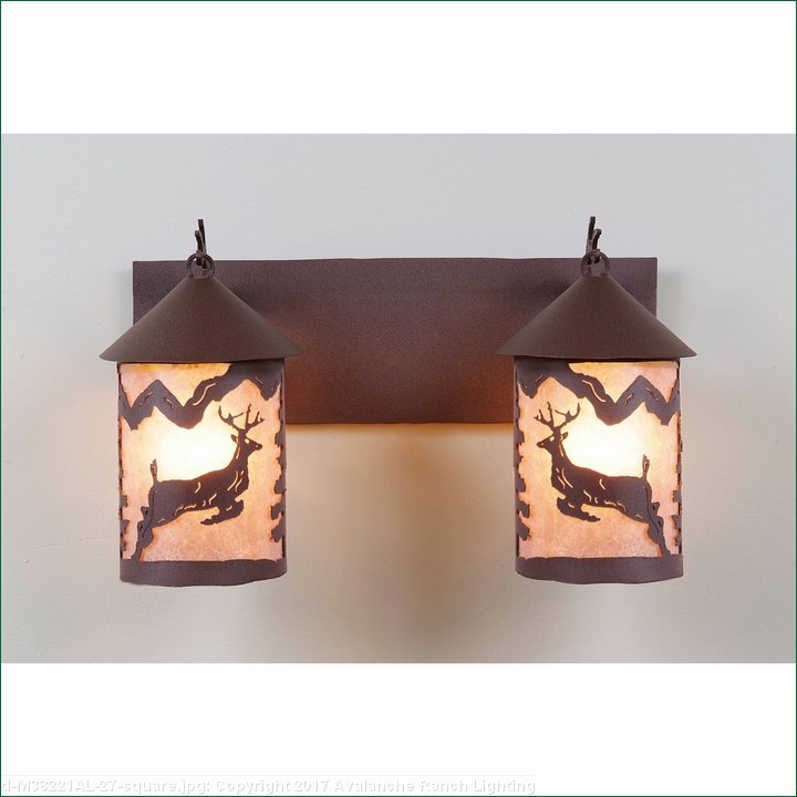 The Cascade Double Bath Vanity Light - Valley Deer features the Cascade small-size lantern hanging from a steel branch arm with a deer metal art image on the front of the lanterns, facing each other and a single spruce tree on the side of each lantern. Mica is on the inside of each lantern cylinder, with a choice of color between Almond or Amber. Attaches to wall with a separate 4 inch high fireplate which allows for direct placement over a junction box or 8 inches to the left or right of center. This rustic bath vanity light is ideal for bringing rustic character and lighting to any bathroom. Hardwire is standard.