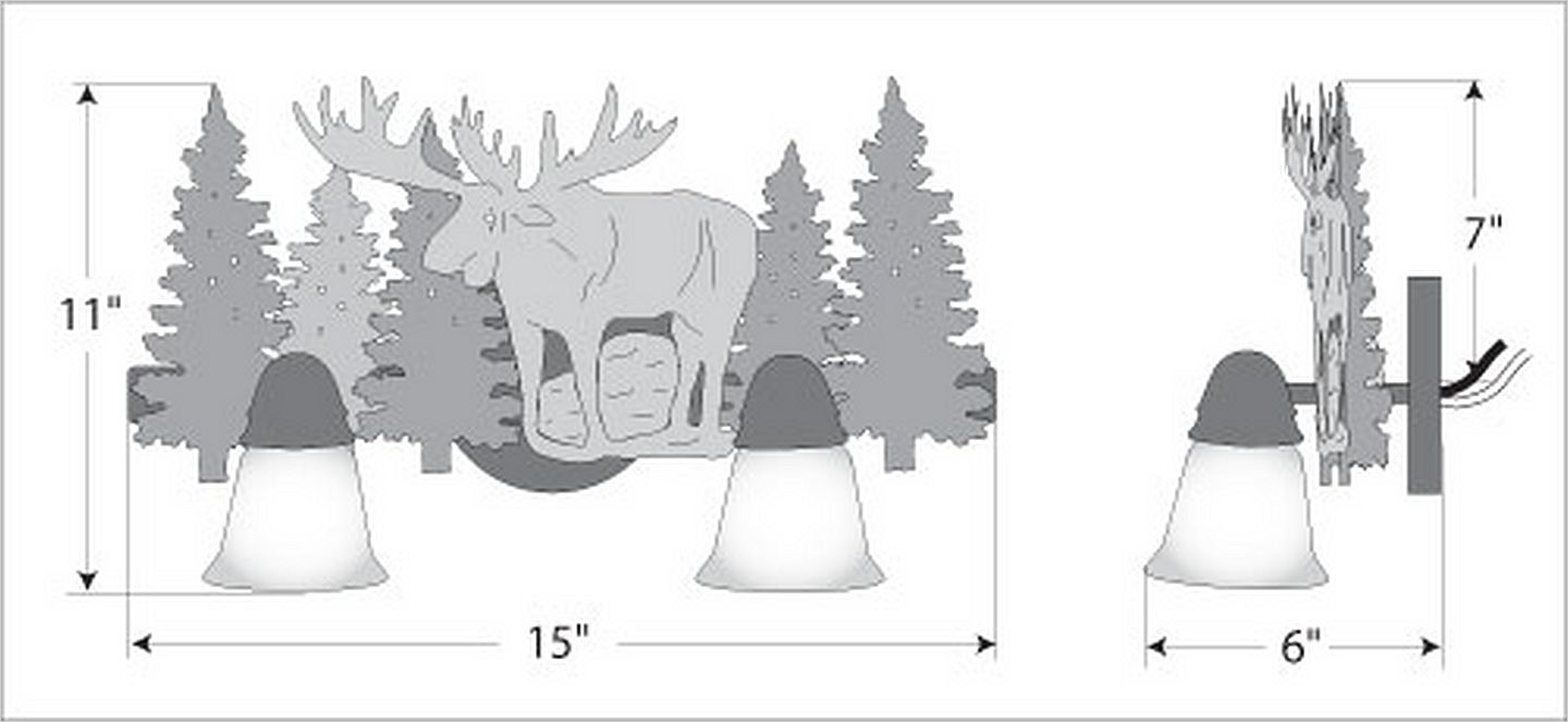 The Lakeside Double Bath Light - Moose features handpainted metal trees and our moose artwork with handcut interior lines. There is a choice of six different glass globes, the smallest of which only takes A15 bulb. This rustic bathroom vanity light will add warm lighting and rustic character to any bathroom, hallway or over a kitchen sink. Note: This fixture was redesigned in March 2010.