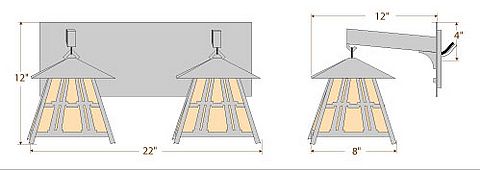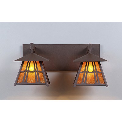 The Smoky Mtn. Double Bath Vanity Light - Eastlake features two Smoky Mtn small lanterns hanging at a slight upward angle from two steel arms. The front and side panels all feature our exclusive mission-style artwork. The lanterns also come with a diffuser material choice between Almond or Amber mica. The fixture attaches to the wall with a separate 4-inch tall fireplate, which allows for either a direct placement over a junction box, or 8 inches to the left or right of center. This mission-style bathroom vanity fixture will bring warm lighting and character to any craftsman style bathroom. Hardwire is standard.