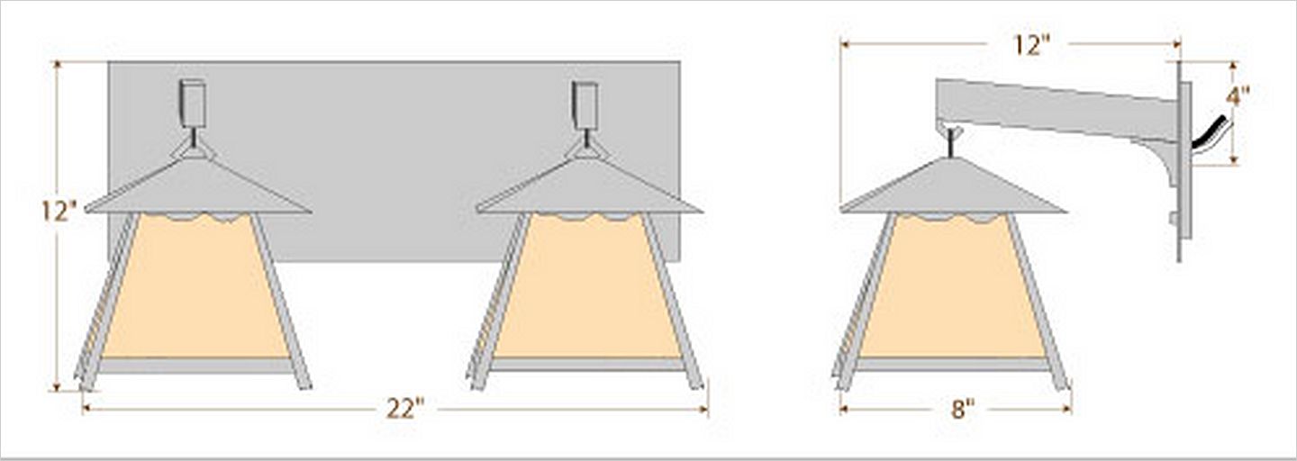 The Smoky Mtn. Double Bath Vanity Light - Rustic Plain features two Smoky Mtn small lanterns hanging at a slight upward angle from two steel arms. Each of the lantern's three facing-sides displays our rustic plain mountain artwork, peeking out along the very top. The lanterns also come with a diffuser material choice between Almond or Amber mica. The fixture attaches to the wall with a separate 4-inch tall fireplate, which allows for either a direct placement over a junction box, or 8 inches to the left or right of center. This bathroom light is ideal for bringing a rustic character to any log home, cabin or northwood lodge-themed room. Hardwire is standard.