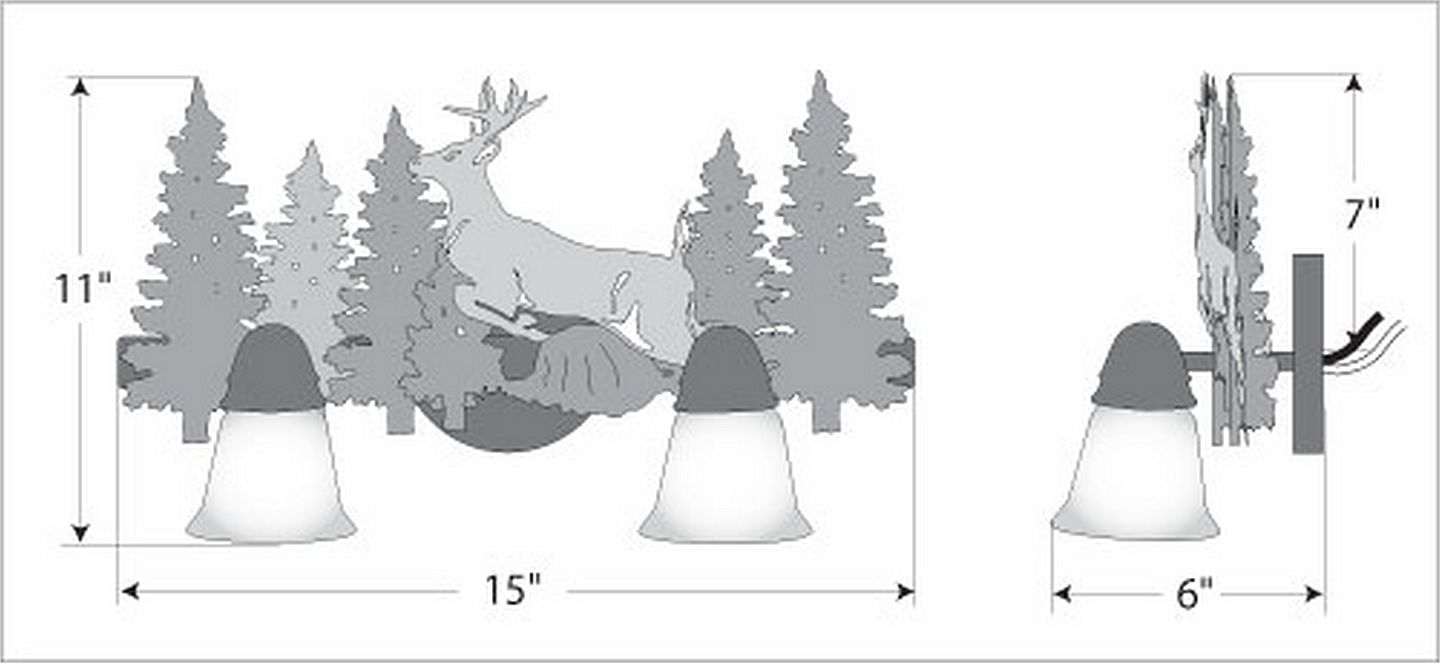The Lakeside Double Bath Light - Deer features handpainted trees and our lasercut deer artwork with 3D antlers. There is a choice of six different glass globes, the smallest of which only takes A15 bulb. This rustic bathroom vanity light will add warm lighting and rustic character to any bathroom, hallway or over a kitchen sink. Note: This fixture was redesigned in March 2010.