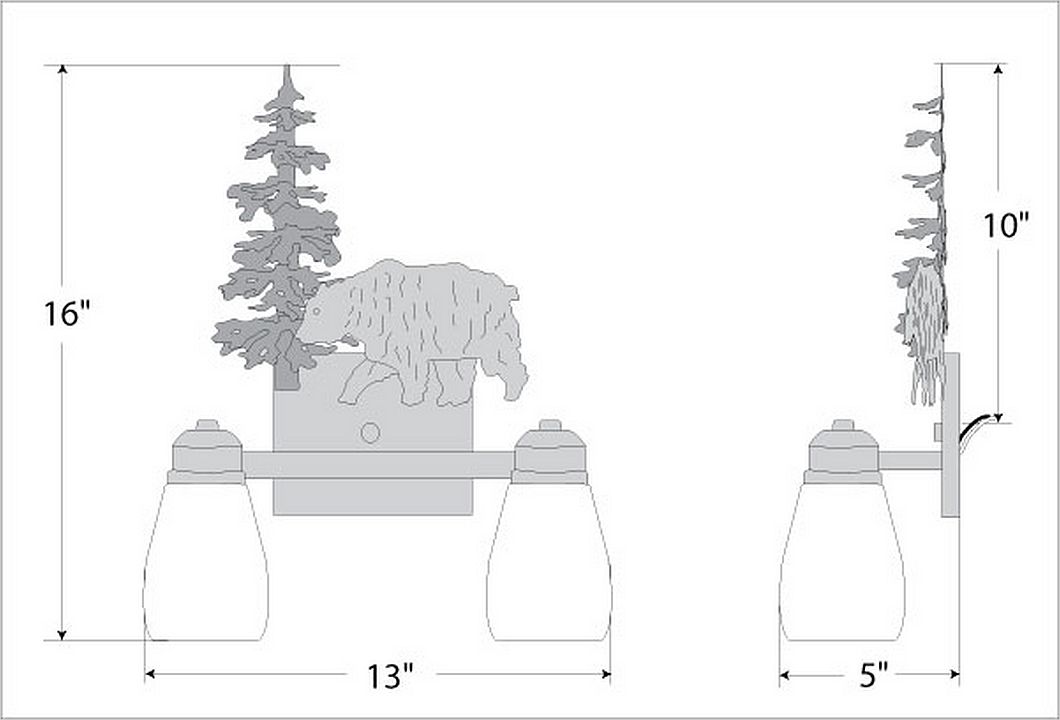 The Parkshire Double Bath Light - Bear is a two-light vanity fixture which features three-dimensional metal art images of both a bear and a cedar tree. There are seven different glass globes that fit this bath vanity, so you can pick a style that suits your decorating needs. This light will provide abundant light to any bathroom, whether in a log cabin, or in a traditional home where a eye-catching decor style is desired. Hardwire is standard.