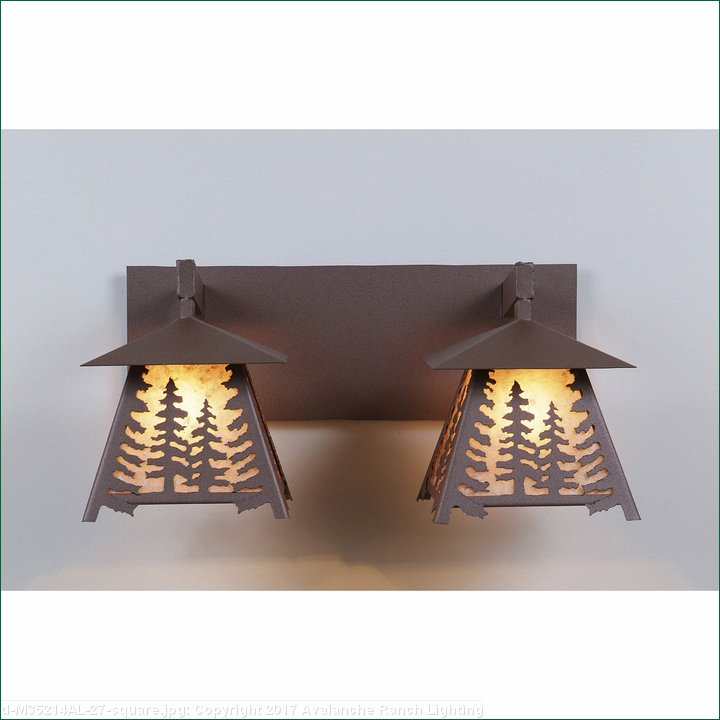 The Smoky Mtn. Double Bath Vanity Light - Spruce features two Smoky Mtn small lanterns hanging at a slight upward angle from two steel arms. A twin spruce image is displayed on the front of each lantern, while a single spruce tree is displayed on the side panels. The lanterns also come with a diffuser material choice between Almond or Amber mica. The fixture attaches to the wall with a separate 4-inch tall fireplate, which allows for either a direct placement over a junction box, or 8 inches to the left or right of center. This bathroom light is ideal for bringing a rustic character to any log home, cabin or northwood lodge-themed room. Hardwire is standard.