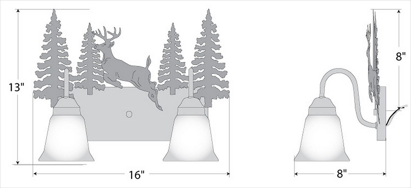 Affordable and pratical bathroom lights make the Wasatch Bathroom Vanity lights one of our best selling series. Offered with a choice of eight different styles and colors of glass globes, this fixture gives abundant light and rustic character to any bathroom. This item is the Wasatch Double - Valley Deer and is Pictured in Finish #03 - Cedar Green trees and Rust Patina base.