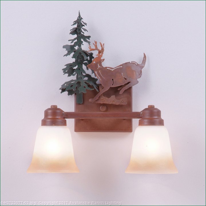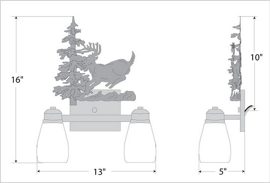 The Parkshire Double Bath Light - Mtn Deer is a two-light vanity fixture which features three-dimensional metal art images of both a mtn deer and a cedar tree. There are seven different glass globes that fit this bath vanity, so you can pick a style that suits your decorating needs. This light will provide abundant light to any bathroom, whether in a log cabin, or in a traditional home where a eye-catching decor style is desired. Hardwire is standard.