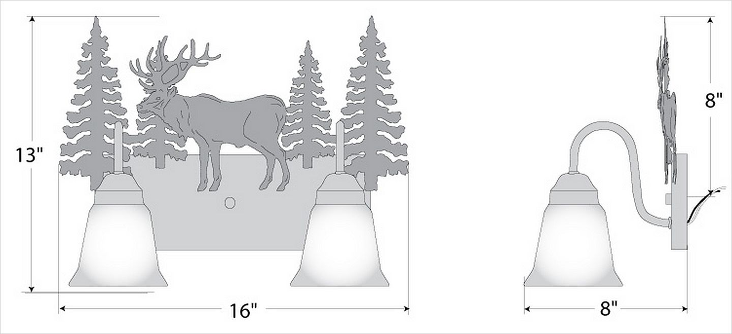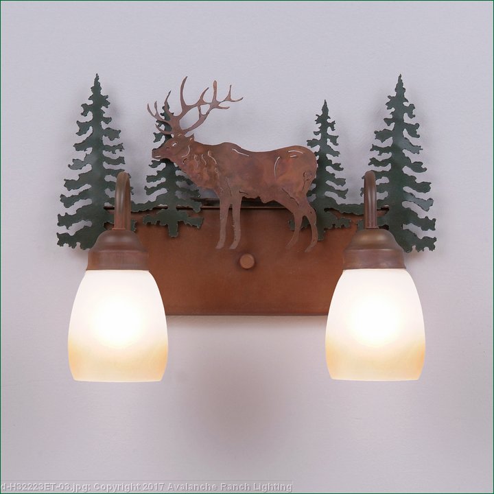 Affordable and pratical bathroom lights make the Wasatch Bathroom Vanity lights one of our best selling series. Offered with a choice of eight different styles and colors of glass globes, this fixture gives abundant light and rustic character to any bathroom. This item is the Wasatch Double - Valley Elk and is Pictured in Finish #03 - Cedar Green trees and Rust Patina base.