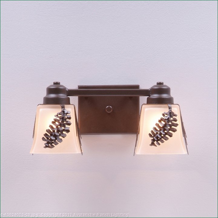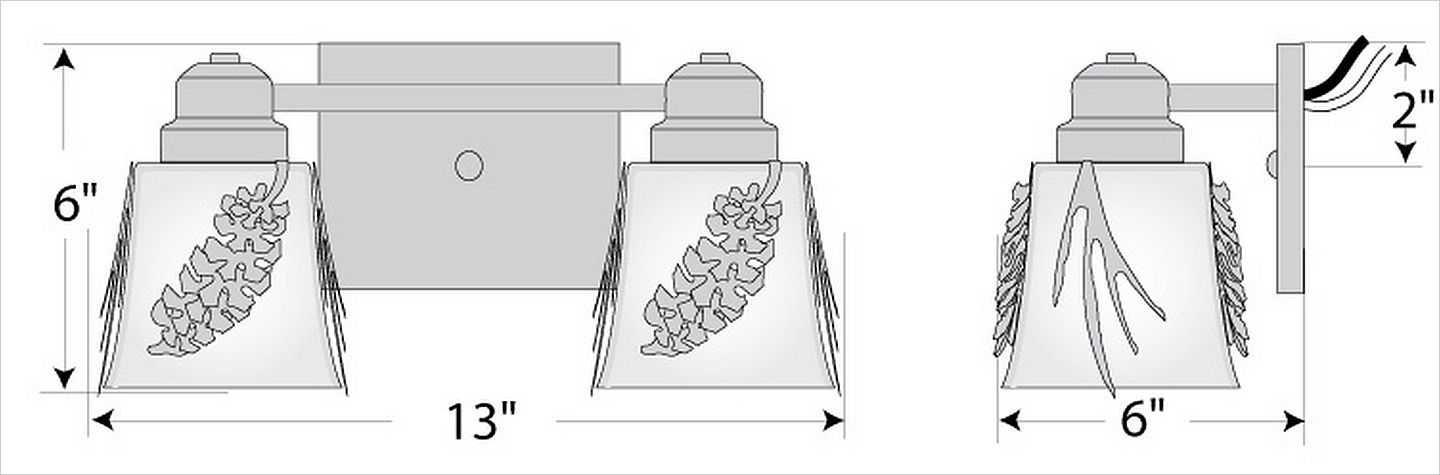 The Woodland Double Bath Light - Spruce Cone features two pieces of square mission style glass and 3D spruce cone designs surrounding the glass. Choice of glass color between Frost Clear and Tea-Stained. This fixture may be hung with bulb pointing up or down. This sophisticated take on traditional rustic lighting will generate a warm atmosphere in any bathroom.
