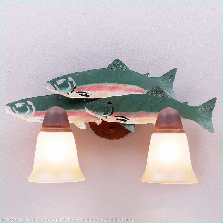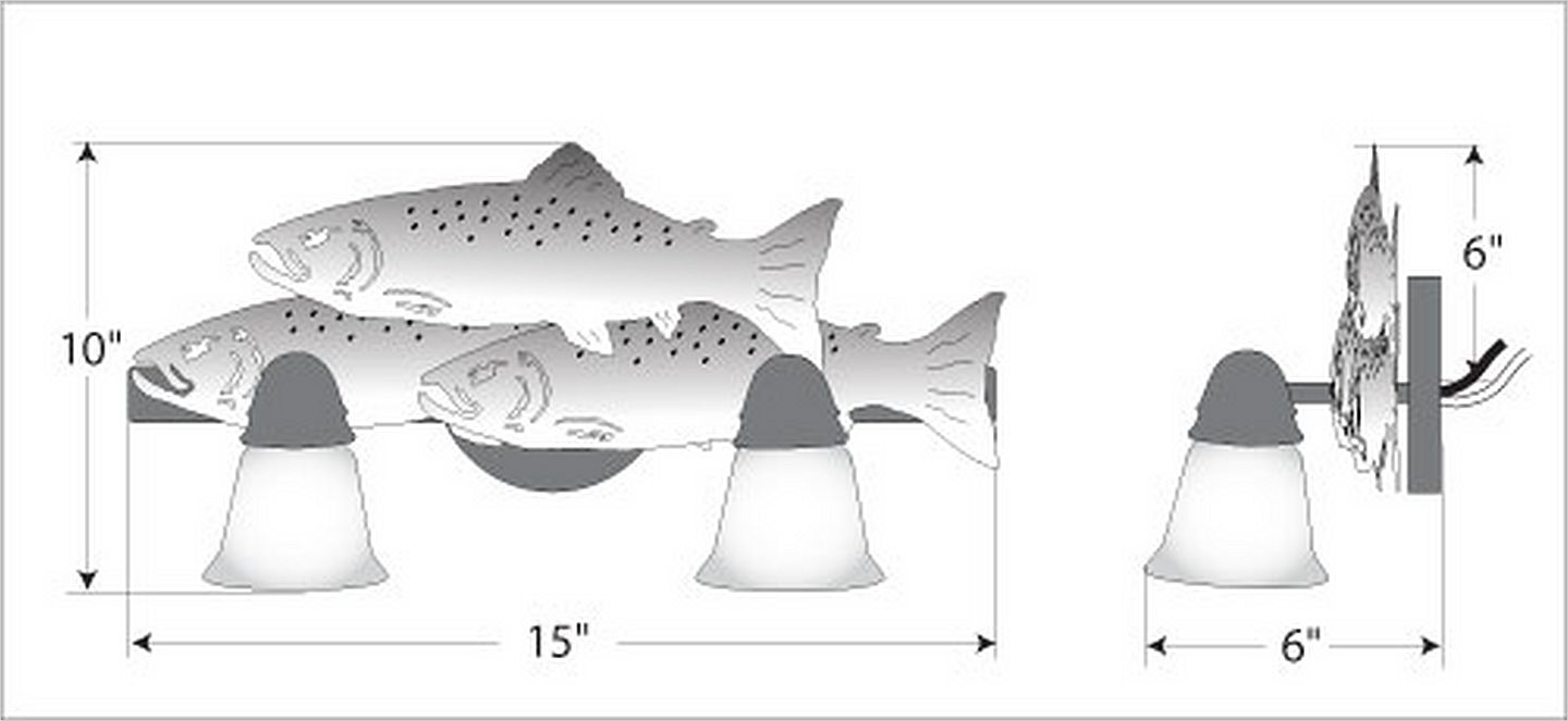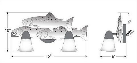 The Lakeside Double Bath Light - Trout features three handpainted trout images running the length of the fixture. There is a choice of six different glass globes, the smallest of which only takes A15 bulb. This rustic bathroom vanity light will add warm lighting and rustic character to any bathroom, hallway or over a kitchen sink. Note: This fixture was redesigned in March 2010.