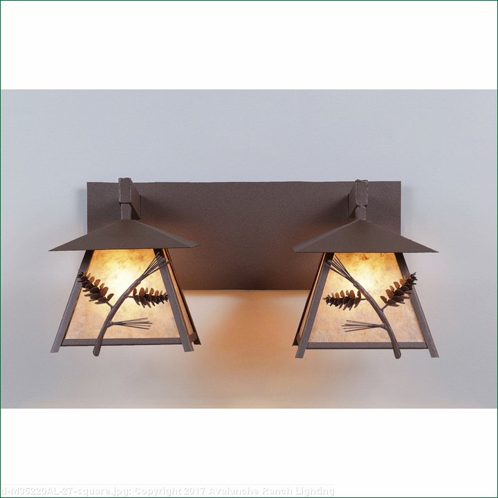 The Smoky Mtn. Double Bath Vanity Light - Pine Cone features two Smoky Mtn small lanterns hanging at a slight upward angle from two steel arms. Our exclusive steel pine cone branch is displayed on the front of each lantern, with the images mirroring each other. The lanterns also come with a diffuser material choice between Almond or Amber mica. The fixture attaches to the wall with a separate 4-inch tall fireplate, which allows for either a direct placement over a junction box, or 8 inches to the left or right of center. This bathroom light is ideal for bringing a rustic character to any log home, cabin or northwood lodge-themed room. Hardwire is standard.