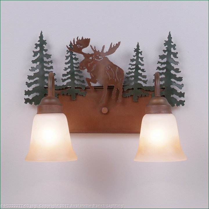 Affordable and pratical bathroom lights make the Wasatch Bathroom Vanity lights one of our best selling series. Offered with a choice of eight different styles and colors of glass globes, this fixture gives abundant light and rustic character to any bathroom. This item is the Wasatch Double - Alaska Moose and is Pictured in Finish #03 - Cedar Green trees and Rust Patina base.