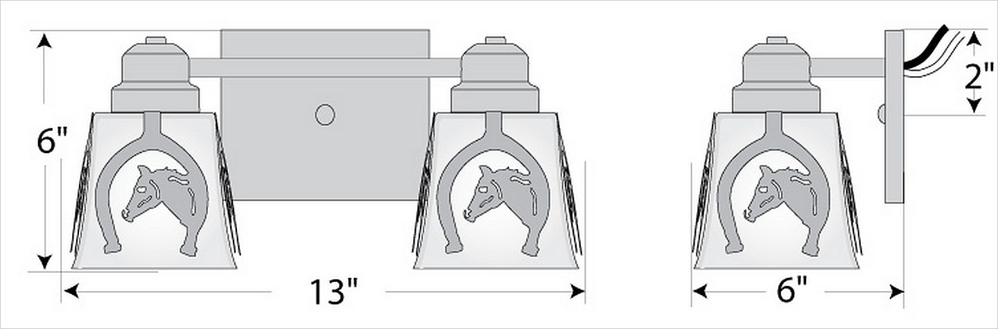 The Woodland Double Bath Light - Horse Horseshoe features two pieces of square mission style glass and horse designs surrounding the glass. The horse head has hand-cut interior lines which gives each image a unique look. Choice of glass color between Frost Clear and Tea-Stained. This fixture may be hung with bulb pointing up or down. This sophisticated take on traditional rustic lighting will generate a warm atmosphere in any bathroom.