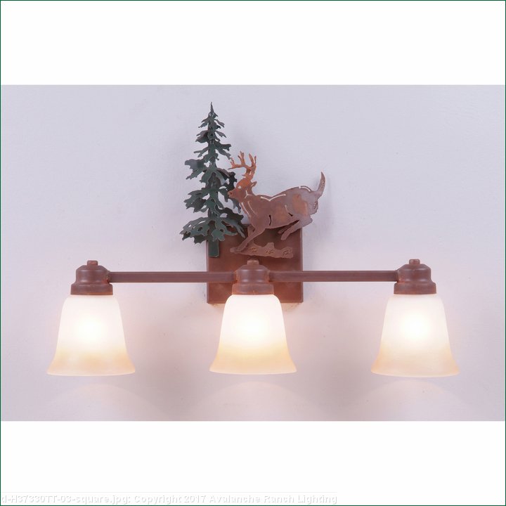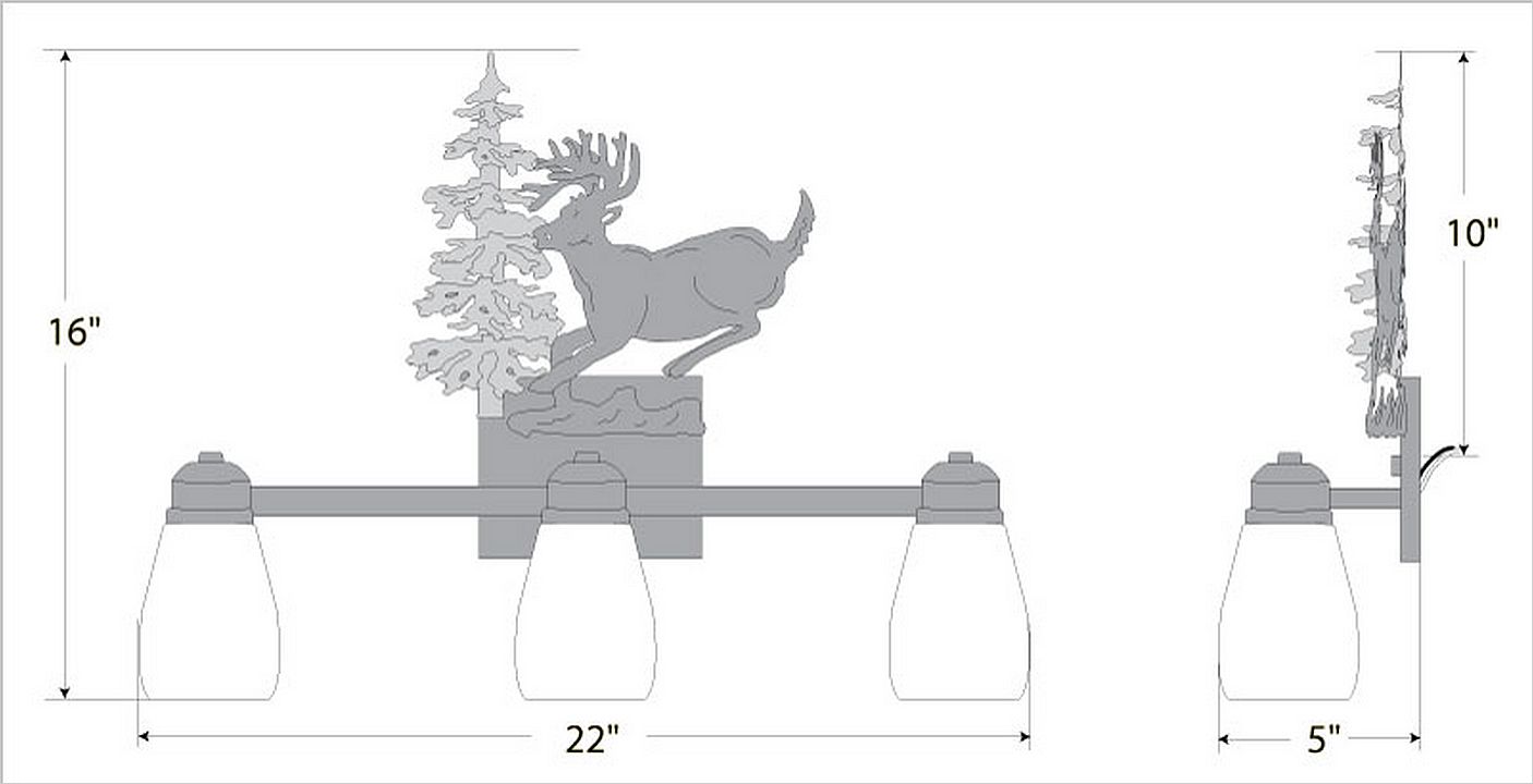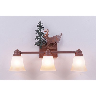 The Parkshire Triple Bath Light - Mtn Deer is a three-light vanity fixture which features three-dimensional metal art images of both a mtn deer and a cedar tree. There are seven different glass globes that fit this bath vanity, so you can pick a style that suits your decorating needs. This light will provide abundant light to any bathroom, whether in a log cabin, or in a traditional home where a eye-catching decor style is desired. Hardwire is standard.