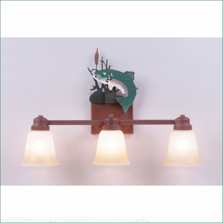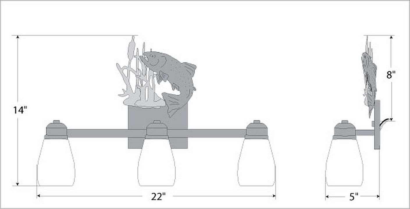 The Parkshire Triple Bath Light - Trout is a three-light vanity fixture which features three-dimensional metal art images of both a trout and cattails. There are seven different glass globes that fit this bath vanity, so you can pick a style that suits your decorating needs. This light will provide abundant light to any bathroom, whether in a log cabin, or in a traditional home where a eye-catching decor style is desired. Hardwire is standard.