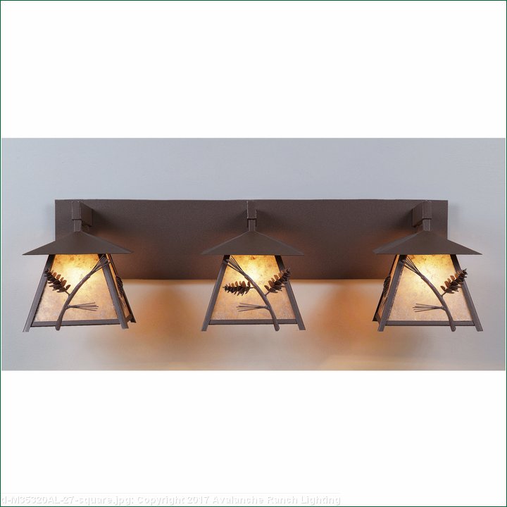 The Smoky Mtn. Triple Bath Vanity Light - Pine Cone features three Smoky Mtn small lanterns hanging at a slight upward angle from three steel arms. Our exclusive steel pine cone branches are displayed on the front of each lantern, along with 3D pine cone artwork on the side panels. The lanterns also come with a diffuser material choice between Almond or Amber mica. The fixture attaches to the wall with a separate 4-inch tall fireplate, which allows for either a direct placement over a junction box, or 8 inches to the left or right of center. This bathroom light is ideal for bringing a rustic character to any log home, cabin or northwood lodge-themed room. Hardwire is standard.