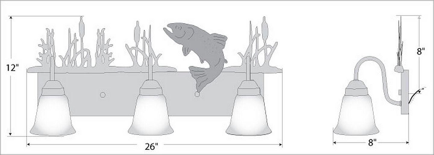 Affordable and pratical bathroom lights make the Wasatch Bathroom Vanity lights one of our best selling series. Offered with a choice of eight different styles and colors of glass globes, this fixture gives abundant light and rustic character to any bathroom. This item is the Wasatch Triple - Trout and is Pictured in Finish #05 - Fish Stain with Cedar Green cattails and Rust Patina base.