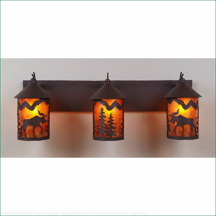 The Cascade Triple Bath Vanity Light - Moose features the Cascade small-size lantern hanging from a steel branch arm with a moose metal art image on the front of the lanterns, facing each other and a single spruce tree on the side of each lantern. Mica is on the inside of each lantern cylinder, with a choice of color between Almond or Amber. Attaches to wall with a separate 4 inch high fireplate which allows for direct placement over a junction box or 8 inches to the left or right of center. This rustic bath vanity light is ideal for bringing rustic character and lighting to any bathroom. Hardwire is standard.