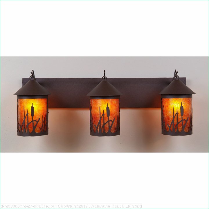 The Cascade Triple Bath Vanity Light - Cattails features the Cascade small-size lantern hanging from a steel branch arm with a Cattails metal art image on the front and on each side of each lantern. Mica is on the inside of each lantern cylinder, with a choice of color between Almond or Amber. Attaches to wall with a separate 4 inch high fireplate which allows for direct placement over a junction box or 8 inches to the left or right of center. This rustic bath vanity light is ideal for bringing rustic character and lighting to any bathroom. Hardwire is standard.