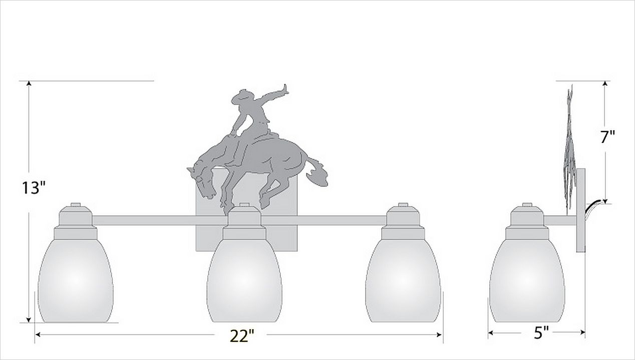 The Parkshire Triple Bath Light - Bucking Bronco is a three-light vanity fixture which feature a three-dimensional image of a cowboy riding a bucking brunco. There are seven different glass globes that fit this bath vanity, so you can pick a style that suits your decorating needs. This western styled bath light will provide abundant light to any bathroom, whether in a log cabin, or in a horse tack room where a eye-catching decor style is desired. Hardwire is standard.