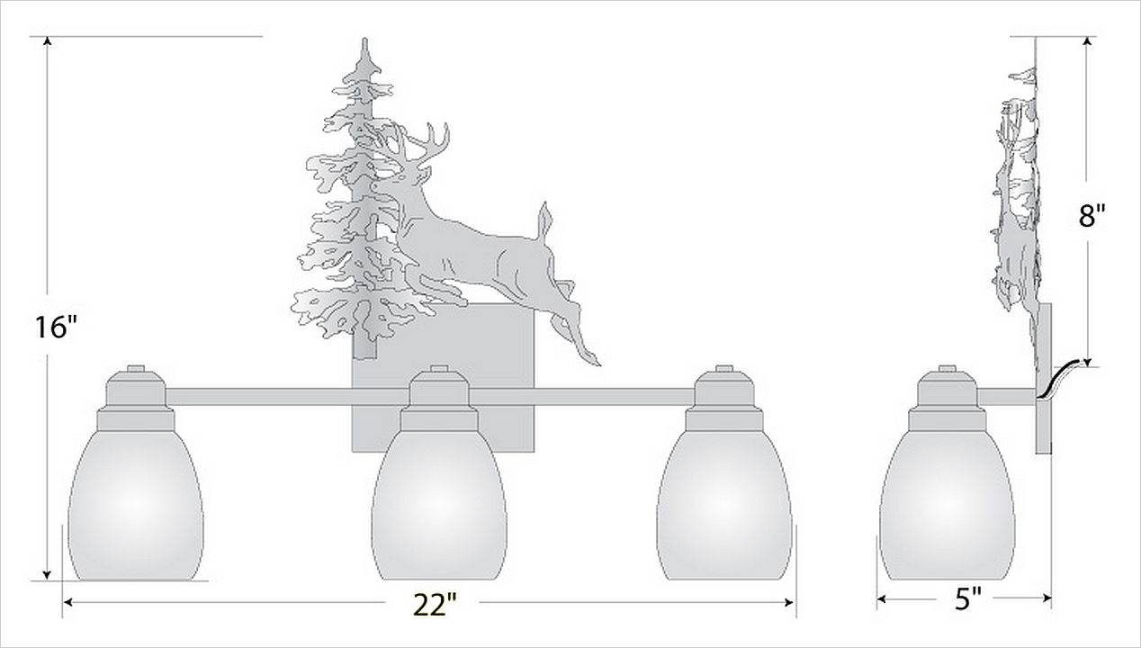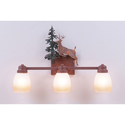 The Parkshire Triple Bath Light - Valley Deer is a three-light vanity fixture which features three-dimensional metal art images of both a deer and a cedar tree. There are seven different glass globes that fit this bath vanity, so you can pick a style that suits your decorating needs. This light will provide abundant light to any bathroom, whether in a log cabin, or in a traditional home where a eye-catching decor style is desired. Hardwire is standard.