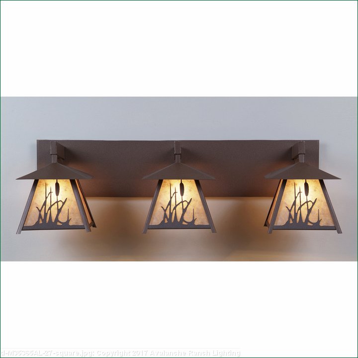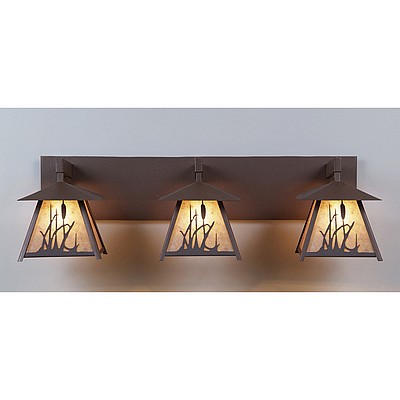 The Smoky Mtn Triple Bath Vanity Light - Cattails features three Smoky Mtn small lanterns hanging at a slight upward angle from three steel arms. The front and side panels all feature our Cattail artwork. The lanterns also come with a diffuser material choice between Almond or Amber mica. The fixture attaches to the wall with a separate 4-inch tall fireplate, which allows for either a direct placement over a junction box, or 8 inches to the left or right of center. This bathroom light is ideal for bringing a rustic character to any log home, cabin or northwood lodge-themed room. Hardwire is standard.