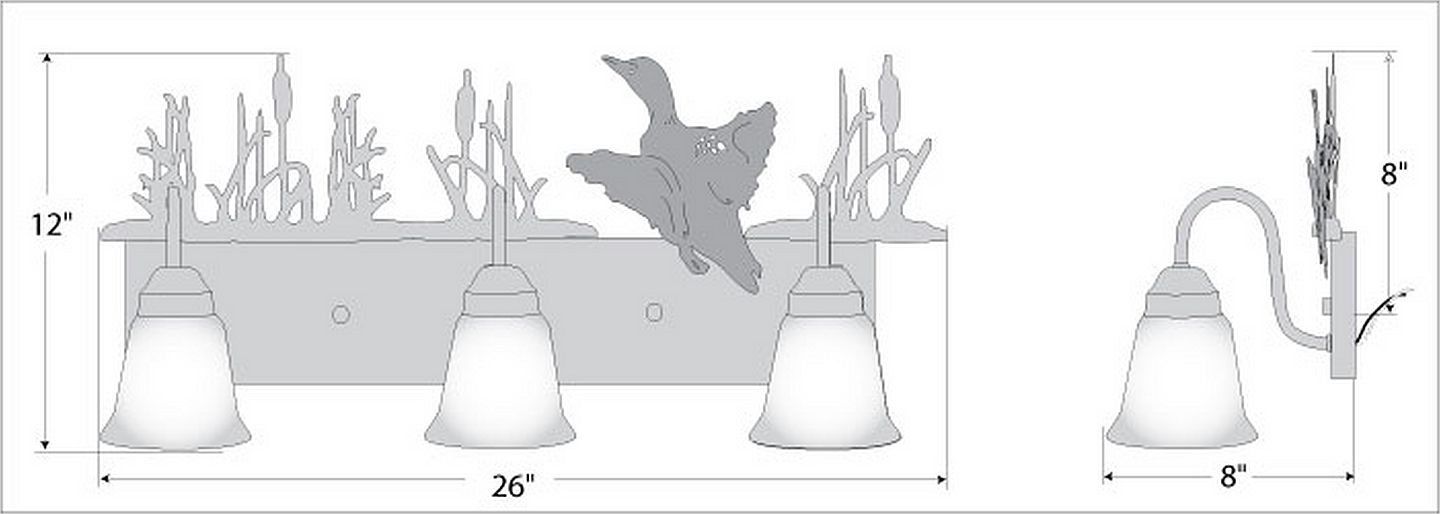 Affordable and pratical bathroom lights make the Wasatch Bathroom Vanity lights one of our best selling series. Offered with a choice of eight different styles and colors of glass globes, this fixture gives abundant light and rustic character to any bathroom. This item is the Wasatch Triple - Loon and is Pictured in Finish #03 - Cedar Green cattails and Rust Patina base.
