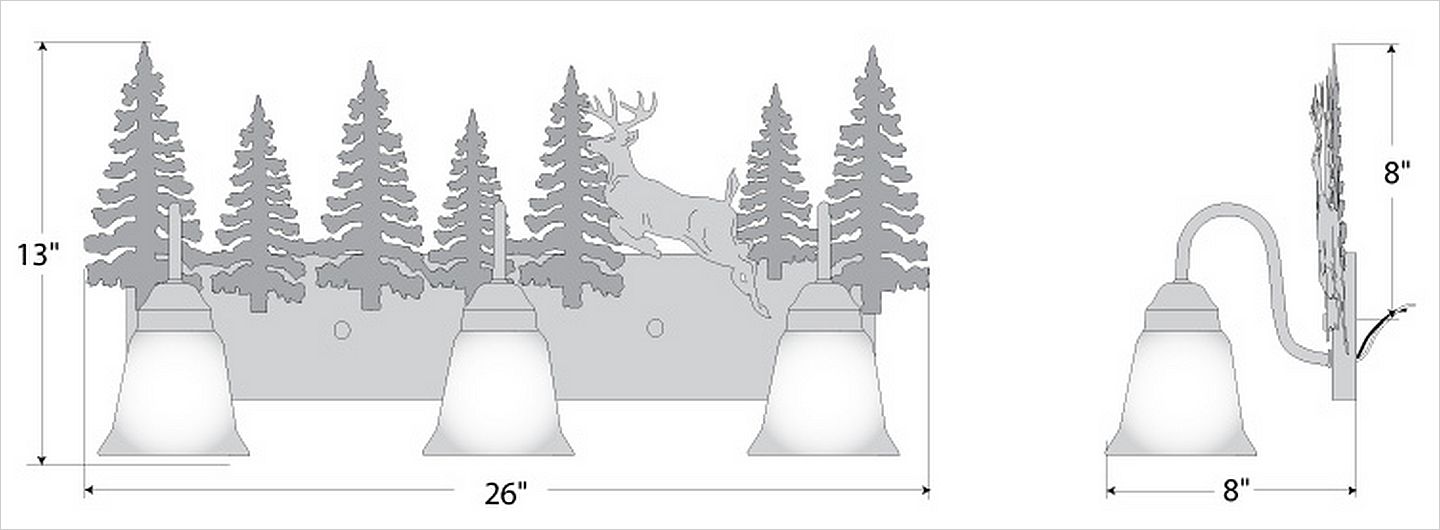 Affordable and pratical bathroom lights make the Wasatch Bathroom Vanity lights one of our best selling series. Offered with a choice of eight different styles and colors of glass globes, this fixture gives abundant light and rustic character to any bathroom. This item is the Wasatch Triple - Valley Deer and is Pictured in Finish #03 - Cedar Green trees and Rust Patina base.