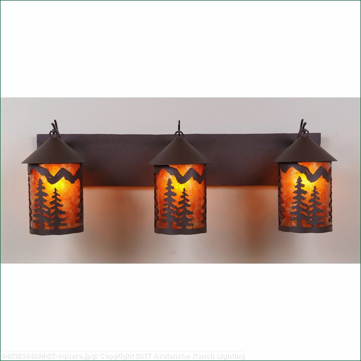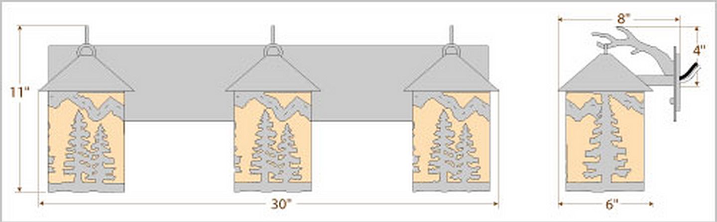 The Cascade Triple Bath Vanity Light - Spruce Tree features the Cascade small-size lantern hanging from a steel branch arm with a twin spruce tree metal art image on the front and a single spruce tree on each side of each lantern. Mica is on the inside of each lantern cylinder, with a choice of color between Almond or Amber. Attaches to wall with a separate 4 inch high fireplate which allows for direct placement over a junction box or 8in. to the left or right of center. This rustic bath vanity light is ideal for bringing rustic character and lighting to any bathroom. Hardwire is standard.