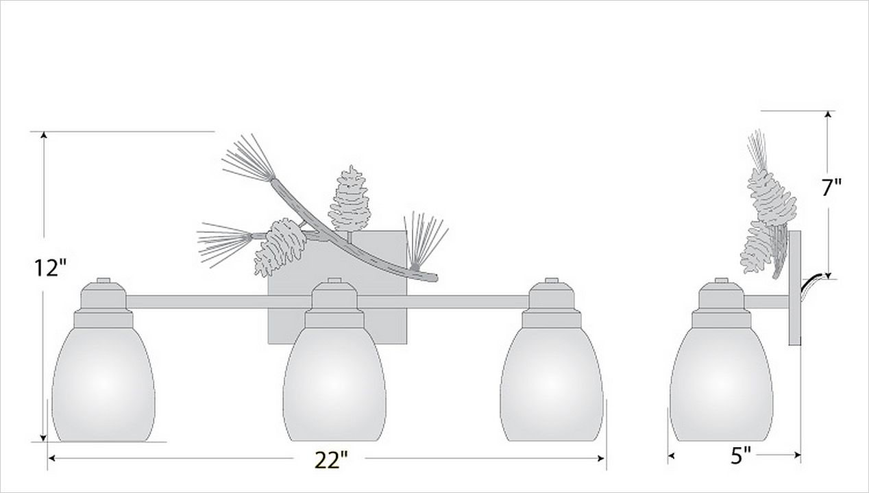 The Parkshire Triple Bath Light - Pine Cone is a three-light vanity fixture which features simple rustic styling. These pine cones are 3D and made of steel, with pine needles and a rustic branch, this is a very smart choice. There are seven different glass globes that fit this bath vanity, so you can pick a style that suits your decorating needs. This light will provide abundant light to any bathroom, whether in a log cabin, or in a traditional home where a eye-catching decor style is desired. Hardwire is standard.