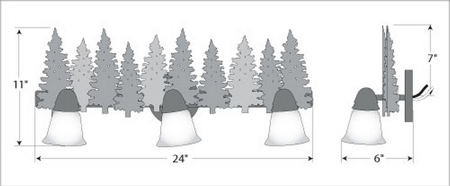 The Lakeside Triple Bath Light - Pine features hand painted metal trees running the whole length of the fixture. There is a choice of six different glass globes, the smallest of which only takes A15 bulb. This rustic bathroom vanity light will add warm lighting and rustic character to any bathroom, hallway or over a kitchen sink. Note: This fixture was redesigned in March 2010.