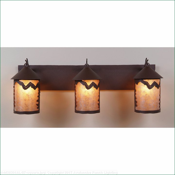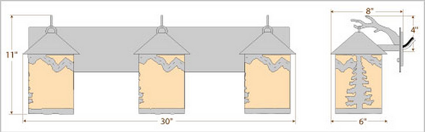 The Cascade Triple Bath Vanity Light - Rustic Plain features the Cascade small-size lantern hanging from a steel branch arm with a mountain metal art image on the front and a single spruce tree on each side of each lantern. Mica is on the insides of each lantern cylinder, with a choice of color between Almond or Amber. Attaches to wall with a separate plate which allows for direct placement over a junction box or 8 inches to the left or right of center. This rustic bath vanity light is ideal for bringing rustic character and lighting to any bathroom.
