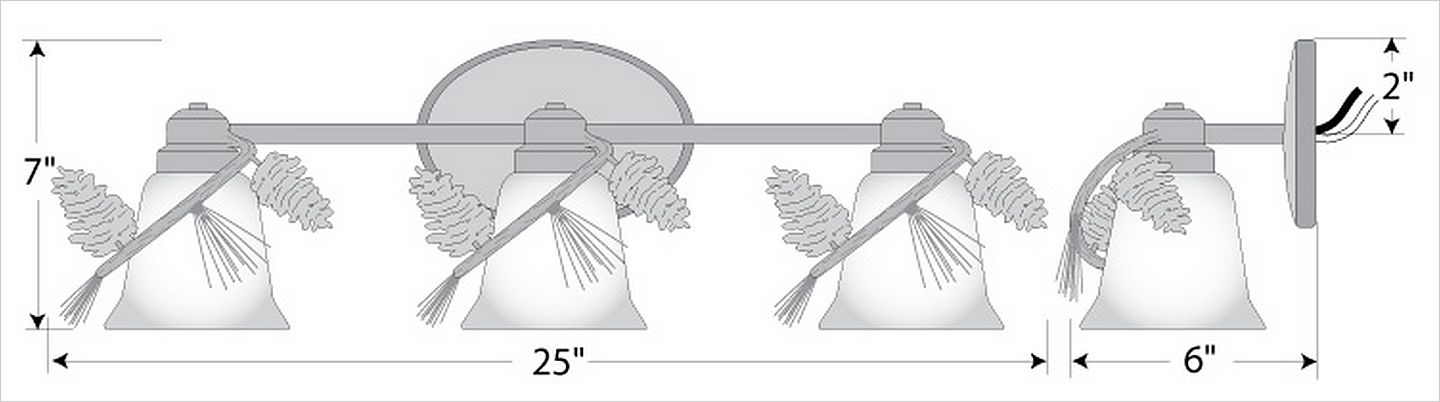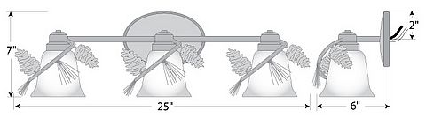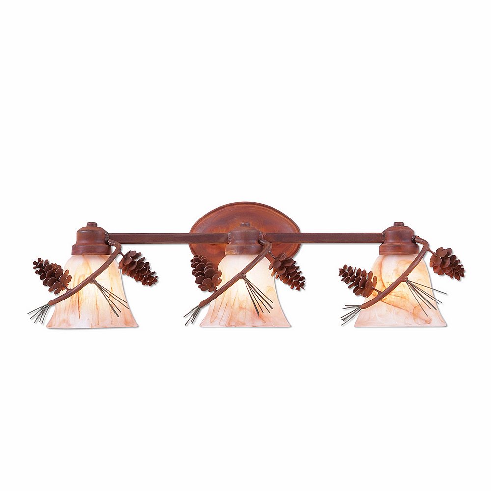 The Sienna Triple Bath Vanity Light - Pine Cone features our exclusive handmade metal pine cones and pine needles attached to a textured metal branch and a choice of glass between six different glass globes. This rustic bath light is great for anywhere to add warm lighting and rustic charcter to their log home, cabin or northwood lodge-themed room.