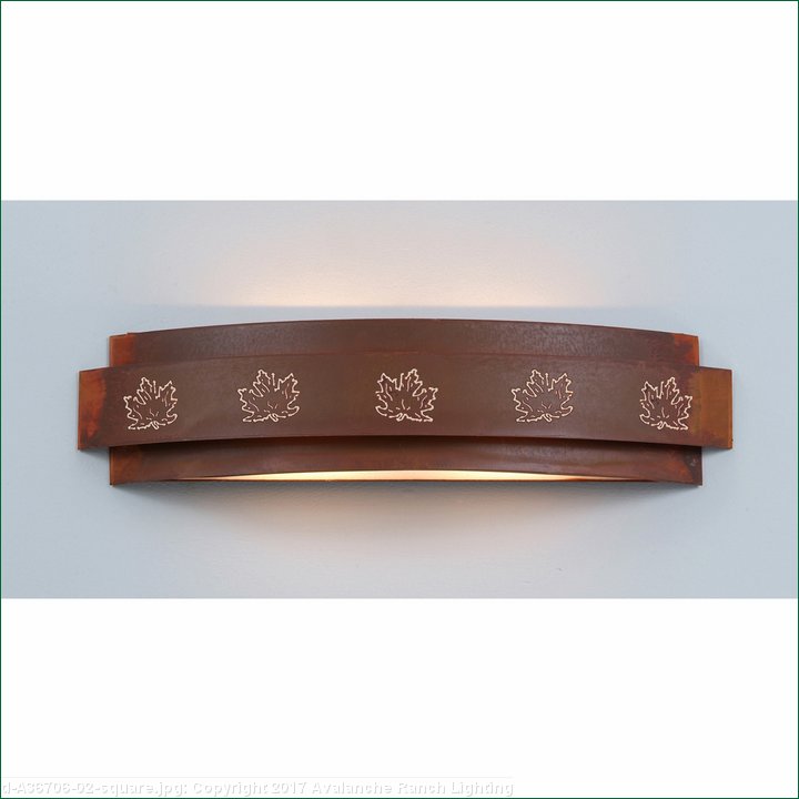 The Northridge Bath Light - Maple Cutout light features three horizontal bands, with maple leaves cut out of the band across the middle band. This light has a frost glass diffuser bottom and thin acrylic panels are behind the cutouts. Light projects both up and down. This light is ideal for anyone looking for a stylish rustic contemporary look for their bathroom, hallway or home.