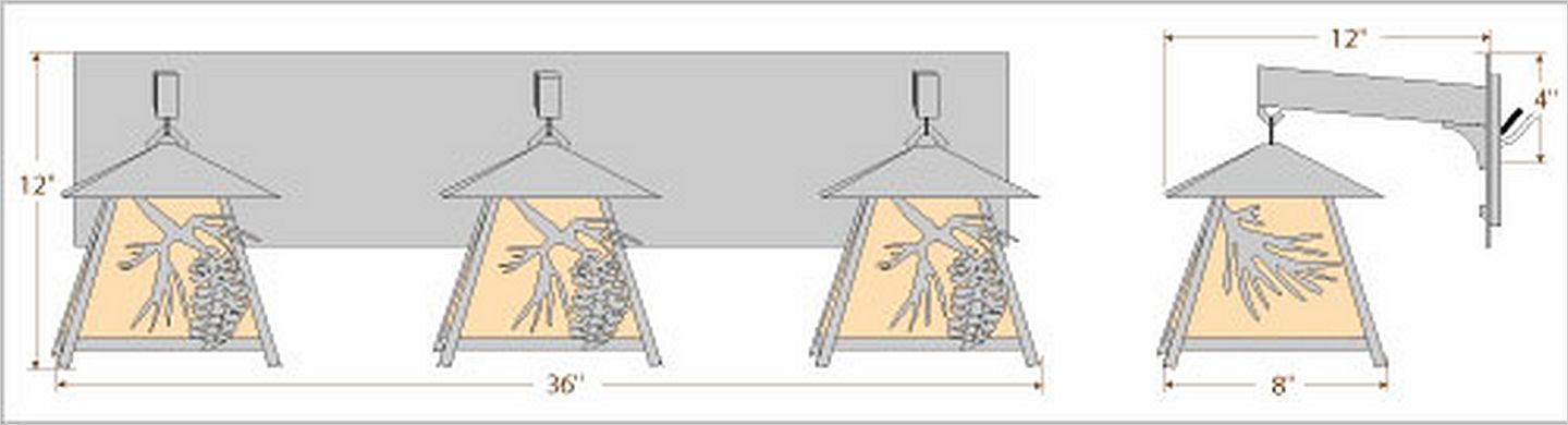 The Smoky Mtn Triple Bath Vanity Light - 3D Spruce Cone features three Smoky Mtn small lanterns hanging at a slight upward angle from three steel arms. Our exclusive Spruce Cone image is featured on the front panels, with spruce needle images on the sides of each lantern. The lanterns also come with a diffuser material choice between Almond or Amber mica. The fixture attaches to the wall with a separate 4-inch tall fireplate, which allows for either a direct placement over a junction box, or 8 inches to the left or right of center. This bathroom light is ideal for bringing a rustic character to any log home, cabin or northwood lodge-themed room. Hardwire is standard.