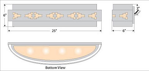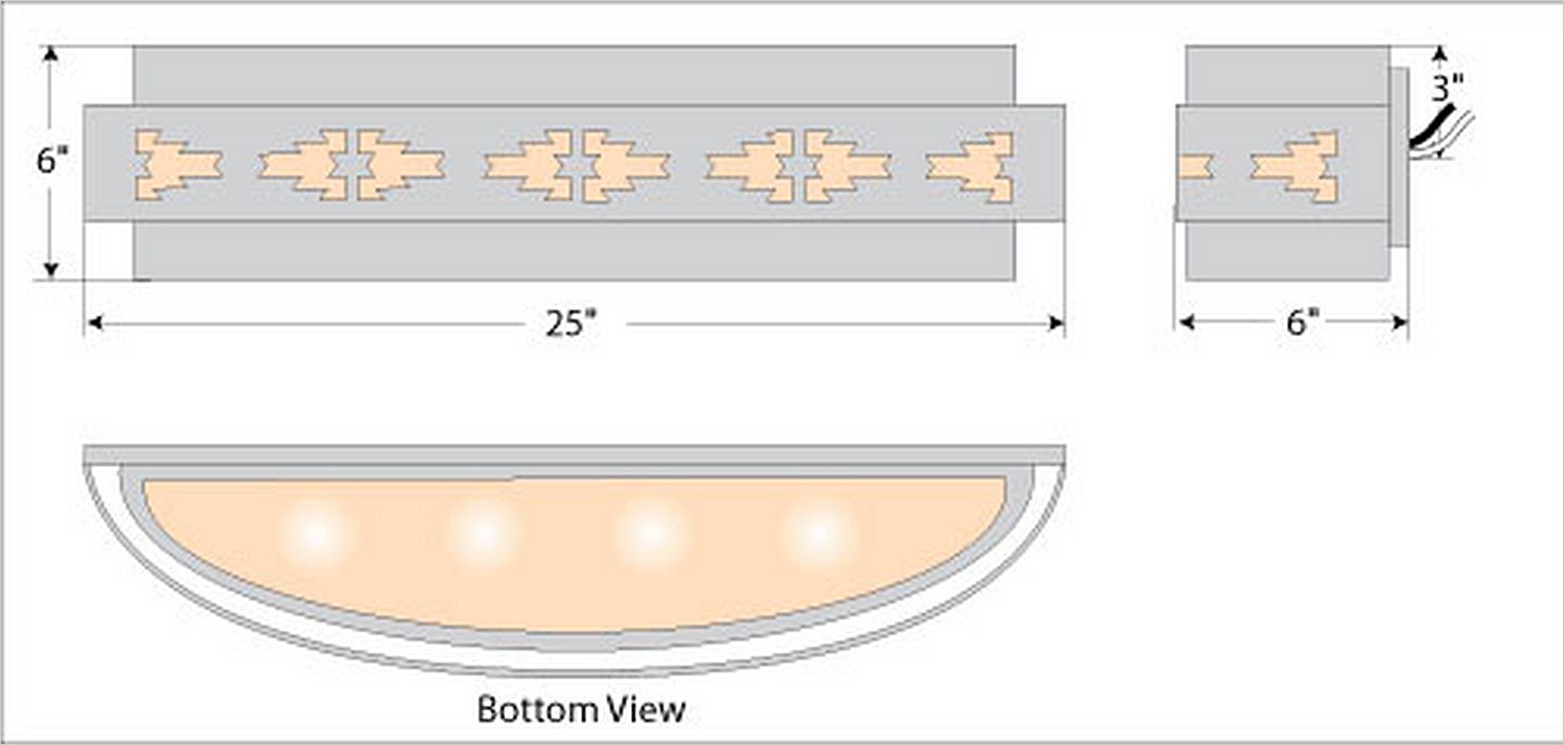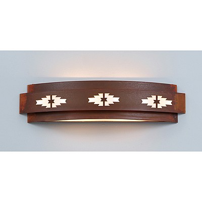 The Northridge Bath Light - Pueblo light features three horizontal bands, with hand-cut Southwest-inspired images across the middle band. This light has a frost glass diffuser bottom and thin acrylic panels are behind the cutouts. Light projects both up and down. This light is ideal for anyone looking for a stylish, Southwestern take on rustic lighting for their bathroom.