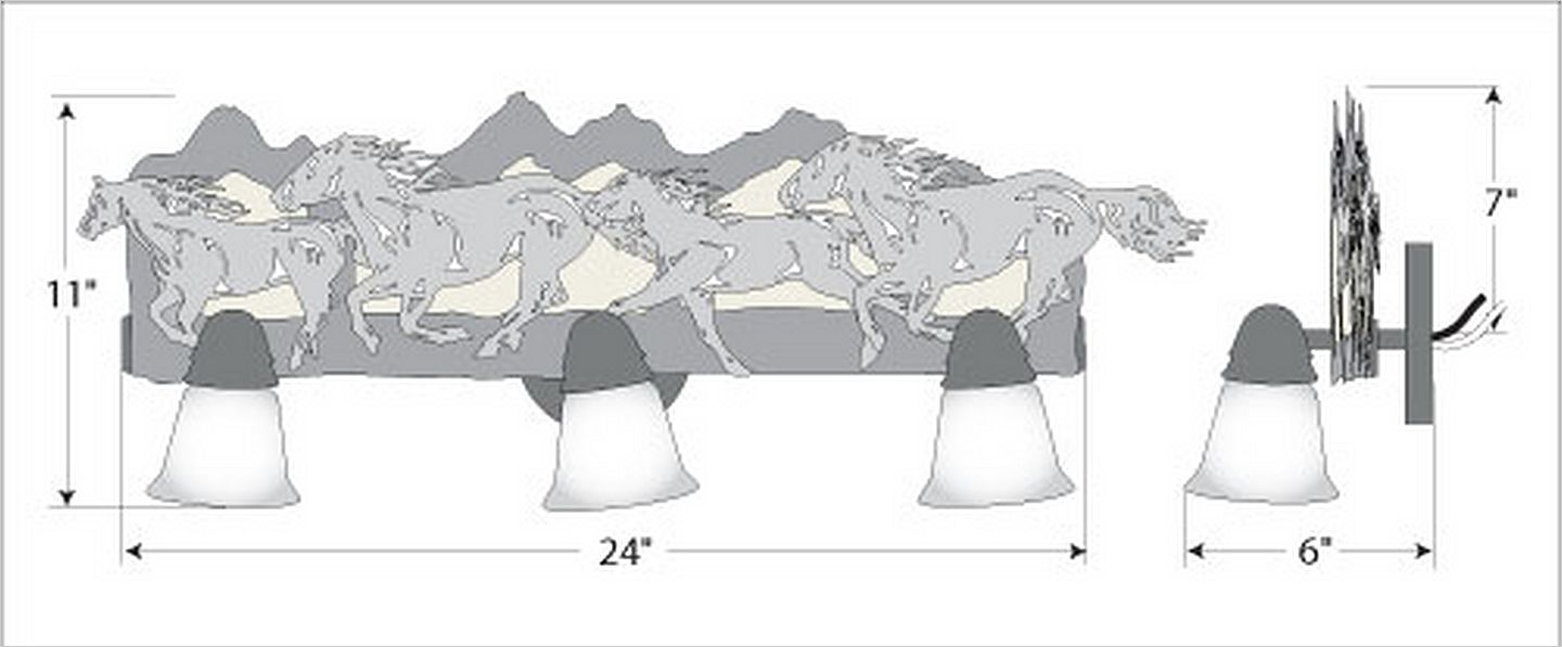 The Lakeside Triple Bath Light - Horse/Mtn features mountains backed with handmade bark paper and our laser cut horses running along it. There is a choice of six different glass globes, the smallest of which only takes A15 bulb. This rustic bathroom vanity light will add warm lighting and rustic character to any bathroom, hallway or over a kitchen sink. Note: This fixture was redesigned in March 2010.