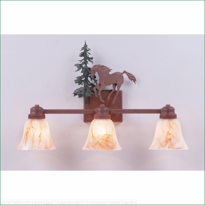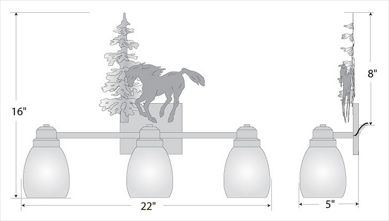 The Parkshire Triple Bath Light - Mtn Horse is a three-light vanity fixture which features three-dimensional metal art images of both a horse and a cedar tree. There are seven different glass globes that fit this bath vanity, so you can pick a style that suits your decorating needs. This light will provide abundant light to any bathroom, whether in a log cabin, or in a traditional home where a eye-catching decor style is desired. Hardwire is standard.