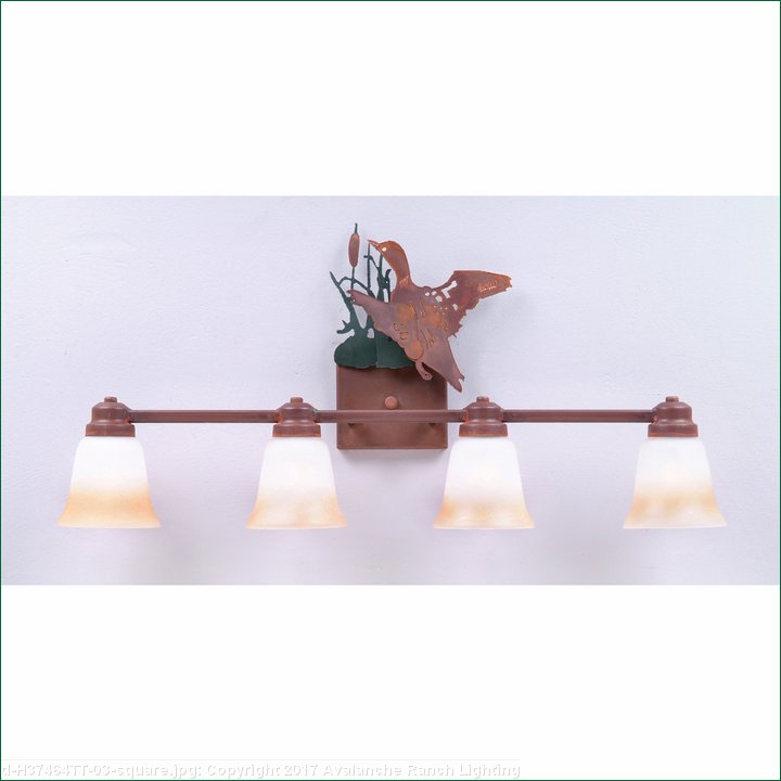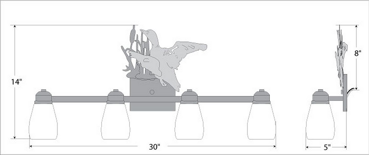 The Parkshire Quad Bath Light - Loon is a four-light vanity fixture which features three-dimensional metal art images of both a loon and cattails. There are seven different glass globes that fit this bath vanity, so you can pick a style that suits your decorating needs. This light will provide abundant light to any bathroom, whether in a log cabin, or in a traditional home where a eye-catching decor style is desired. Hardwire is standard.