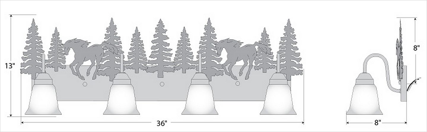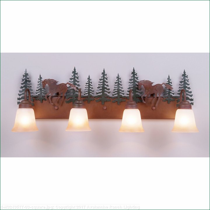 Affordable and pratical bathroom lights make the Wasatch Bathroom Vanity lights one of our best selling series. Offered with a choice of eight different styles and colors of glass globes, this fixture gives abundant light and rustic character to any bathroom. This item is the Wasatch Quad - Mtn Horse and is Pictured in Finish #03 - Cedar Green trees and Rust Patina base.