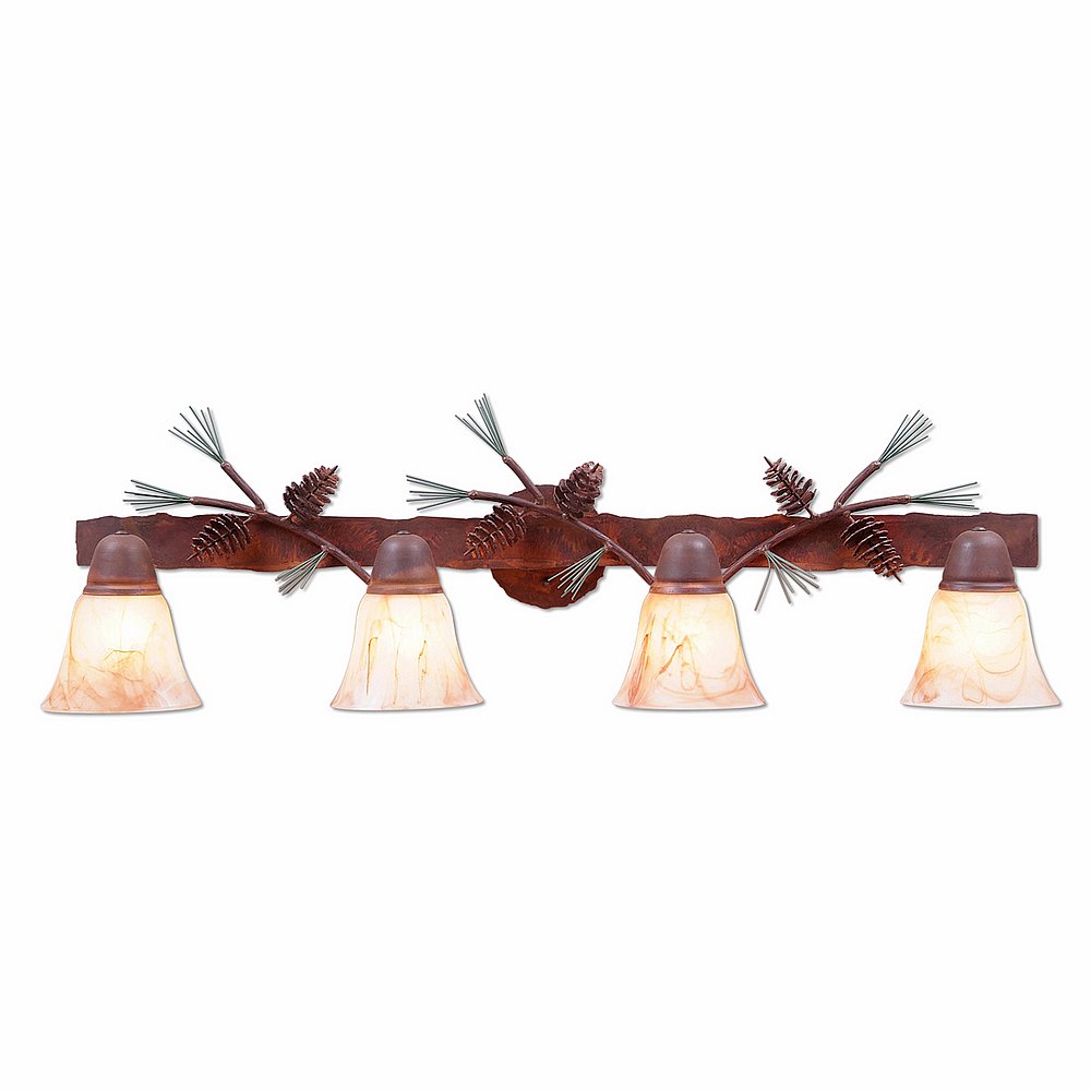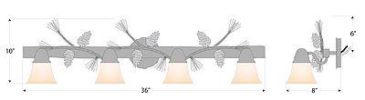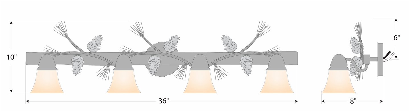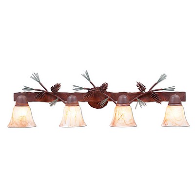 The Lakeside Quad Bath Light - Pine Cone features handmade, metal pine cone, pine needles and a metal bar that looks like a branch, all attached to a rustic band with the two lights. This rustic bathroom vanity light will add warm lighting and rustic character to any bathroom, hallway or over a kitchen sink.