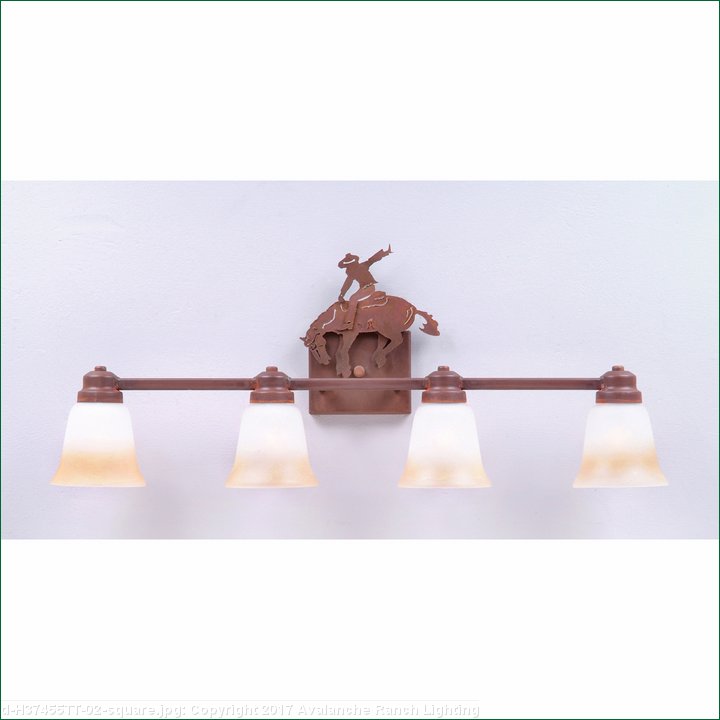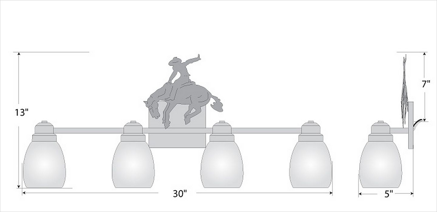 The Parkshire Quad Bath Light - Bucking Bronco is a four-light vanity fixture which feature a three-dimensional image of a cowboy riding a bucking brunco. There are seven different glass globes that fit this bath vanity, so you can pick a style that suits your decorating needs. This light will provide abundant light to any bathroom, whether in a log cabin, or in a horse tack room where a eye-catching decor style is desired. Hardwire is standard.